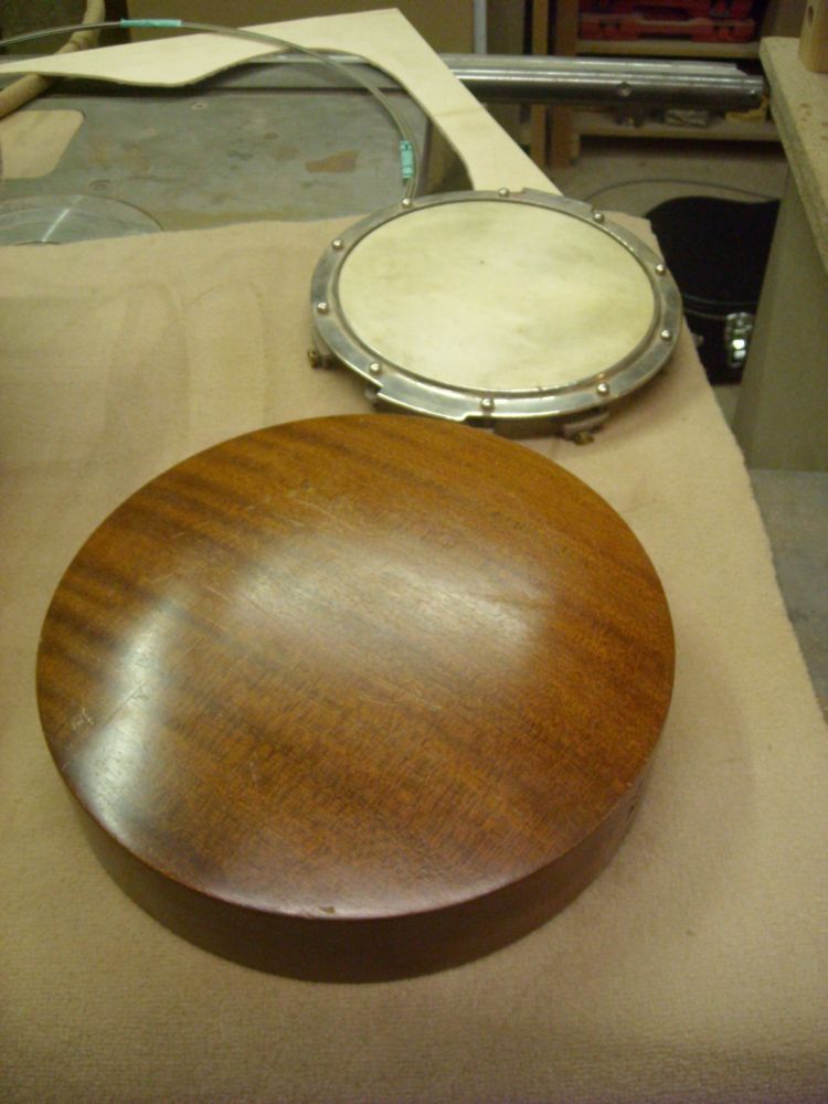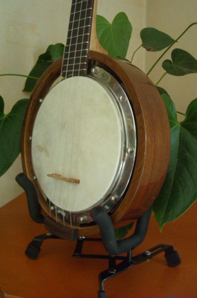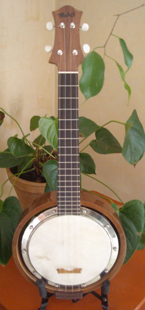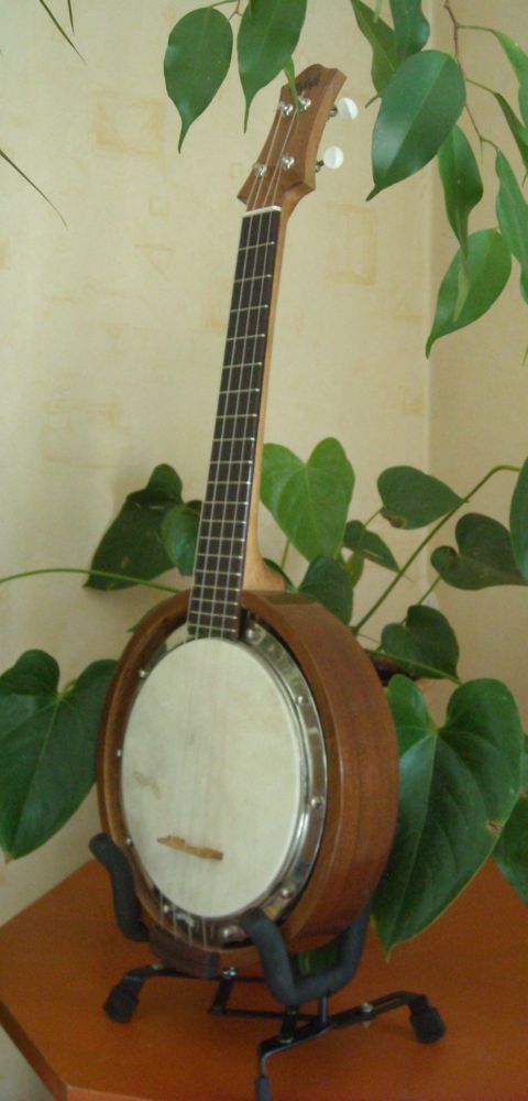 Le corps et le cerclage en métal restaient correct, avec quelques menus travaux, ainsi que le besoin de changer la peau de chèvre.J'ai entrepris pour une amie, de transformer l'instrument en Banjolélé. Avec un nouveau manche ainsi qu'un cordier adapté.